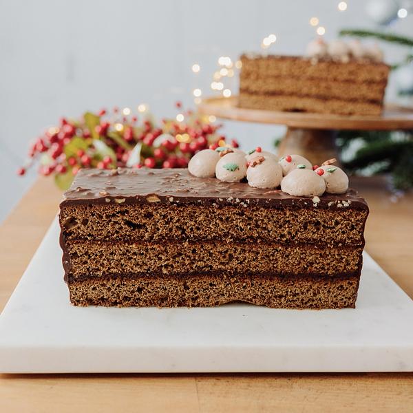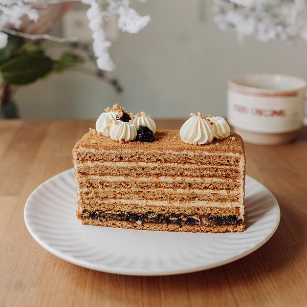 Wielowarstwowe ciasto miodowe przełożone kremem z kwaśnej śmietany i creme fraiche. Dla przełamania słodyczy dodaliśmy warstwę kwaskowatych powideł zdodatkiem brandy, a dla chrupnięcia prażone orzechy laskowe i migdały. Waga około 1kg